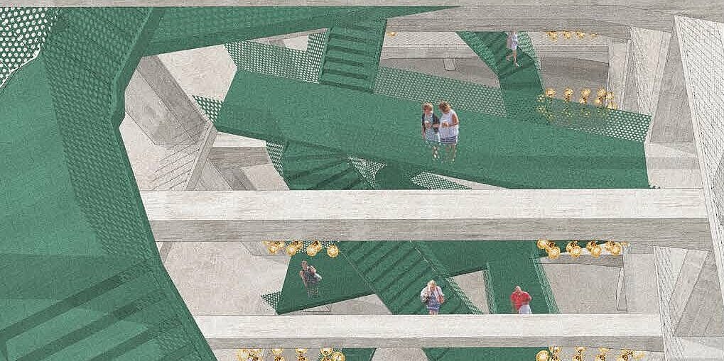 Der Spinnbau verfügt zwar über keinen klassischen Bühnenturm, bietet jedoch große räumliche Potenziale. Durch gezielte Eingriffe in die Bausubstanz schlagen die Studierenden neue, geschossübergreifende Verbindungen vor, um die horizontale Struktur zu durchbrechen und vertikale Verbindungen zu schaffen. Zugleich soll das gesamte Areal um den Spinnbau belebt werden: Der Außenbereich könnte Raum für kreatives Arbeiten bieten, eine Brücke über die Bahngleise eine direkte Verbindung zum TU-Campus schaffen und neues Publikum anziehen.