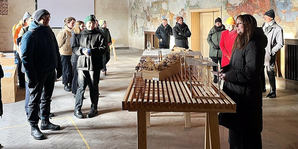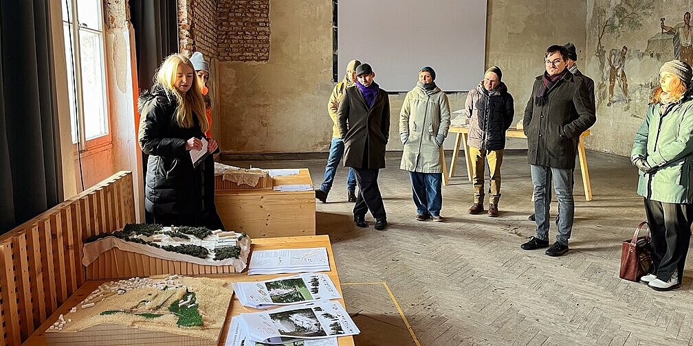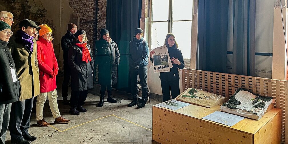 Die Architekturfakultät der OTH Regensburg und die Gedenkstätte in Flossenbürg verbindet seit 2024 eine institutionelle Kooperation, die in mehreren Lehrforschungs- und Forschungsprojekten aktiv gelebt wird. Eine Gruppe ehemaliger und aktiver Studentinnen stellten eine Auswahl der Ergebnisse des Entwurfsprojektes „Treppe der Erinnerung“ im Masterstudiengang Architektur vor. Dr. Timo Saalmann, Leiter der historischen Abteilung der KZ-Gedenkstätte Flossenbürg und Prof. Dr. Elke Nagel führten in einem kurzen Rundgang durch das Steinbruch-Areal. An der Granittreppe, einem der wenigen unverändert überlieferten Zeugnisse der NS-Ausbeutung des Steinbruchs, begann der Bericht der OTH Regensburg mit den bisherigen Ergebnissen bauhistorischen und archäologischen Forschungen. Im ehemaligen Verwaltungsgebäude der SS-Organisation Deutsche Erd- und Steinwerke präsentierten die Studierenden ihre Arbeiten in einer Ausstellung von Modellen, Zeichnungen und Faltbüchern. Prof. Andreas Emminger eröffnete mit einer kurzen Einführung in die Fragestellung und die Motivation für das architektonisch-gestalterische Lehrforschungsprojekt. Die Entwurfsideen erläuterten die Verfasserinnen Eva Hachenberg B.A., Lena Wimmer M.A, Kristina Ebner M.A. und Dana Cameron M.A. und schlugen mit der Reflexion der jeweiligen gestalterischen Wirkung auf den Ort eine Brücke zum übergeordneten Thema des Workshops. Prof. Andreas Emminger und Prof. Andreas Müsseler übernahmen stellvertretend für Julia Beugler M.A. und Aaron Burkhardt M.A. die Projektvorstellungen.